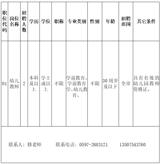 本次公开招聘事业单位编制内幼儿教师2名, 具体详见《龙岩市儿童保育院2022年公开招聘教师岗位表》(附件)。