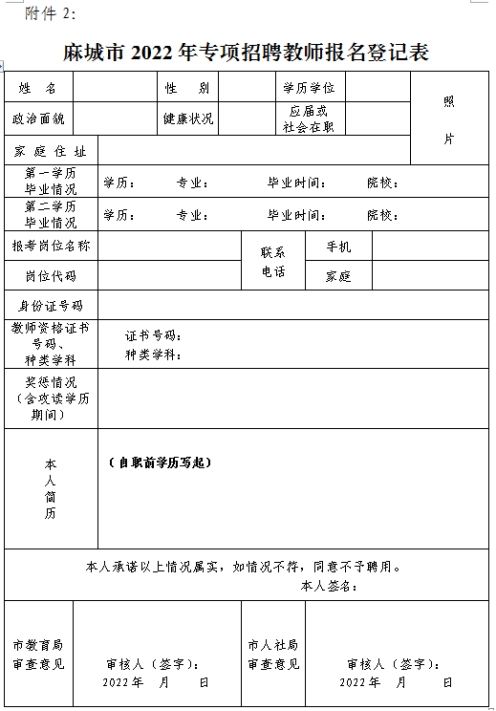 2.《麻城市2022年专项公开招聘教师报名登记表》