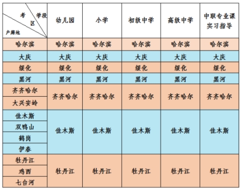 4.考区选择:面试共设哈尔滨、齐齐哈尔、牡丹江、佳木斯、大庆、绥化、黑河七个考区,考生网上报名时须根据户籍(或居住证)所在地,在校生按学籍或户籍所在地按《面试填报考区对照表》选择对应考区,不得跨区报考,农、林系统考生可就近选择考区报考。