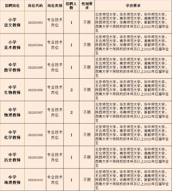 中学教师岗位:数学1人、生物2人、物理2人、化学1人、历史1人、地理1人