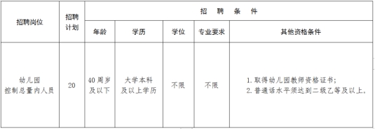 招聘幼儿园控制总量内人员20名。