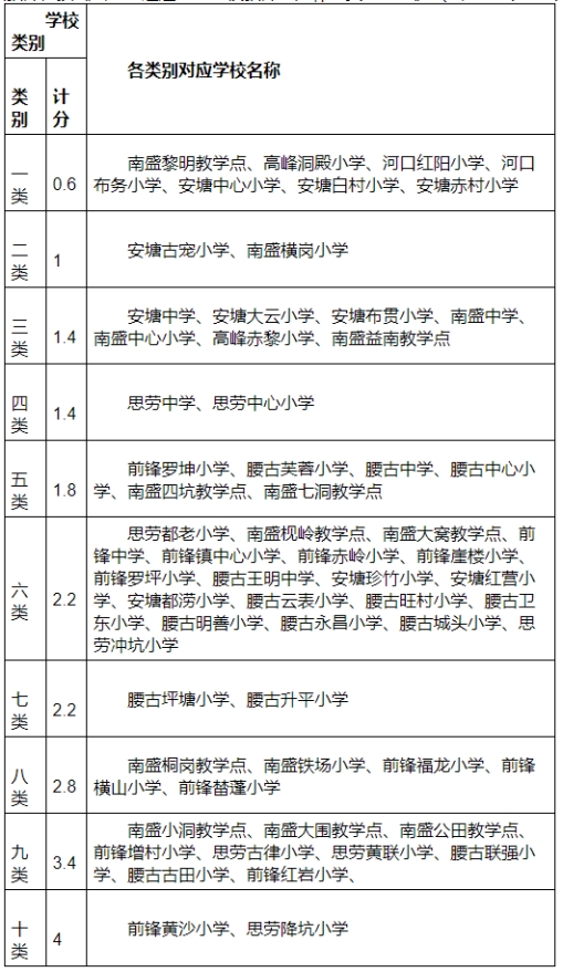 ⑶云城区边远地区学校任教经历计分办法。对不辞劳苦,服务我区边远地区学校的支教教师,按《云城区边远地区学校教师生活补助实施办法》(云区财〔2017〕86号)划定的边远地区学校类别进行计分。各类学校量化计分见下表: