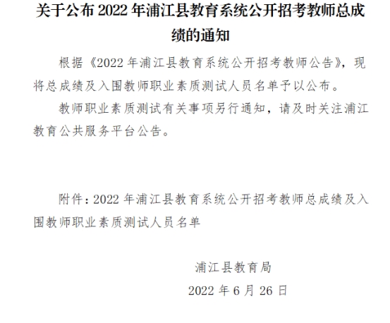 2022年浙江省金华市浦江县教师招考总成绩的通知