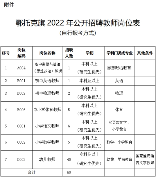 附件:鄂托克旗2022年公开招聘教师岗位表