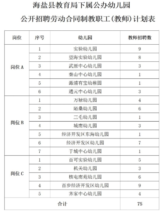 一、计划数:幼儿教师75名(分岗位A、岗位B、岗位C)、卫生保健员10名。