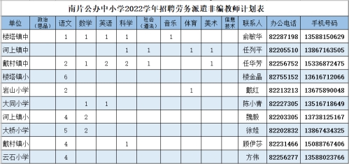 为进一步加强南片公办中小学师资队伍建设,根据各学校2022学年师资需求,决定面向社会公开招聘劳务派遣非编教师若干名,相关学校具体岗位及招聘要求公告如下: