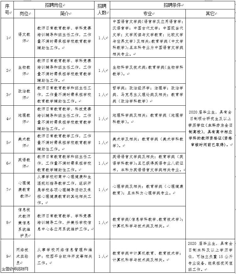 我校2020年拟招聘专业技术人员共9名,其中语文教师、生物教师、政治教师、地理教师、美术教师、英语教师、心理健康教育教师、信息技术教师兼信息系统维护员、网络技术实验员各1人。