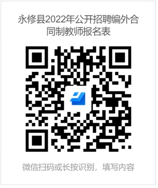 2、报考方式。报考采取网上报考方式,考生应诚信报考,考生关注永修县人民政府官网(网址:http://www.yongxiu.gov.cn/),从永修县人民政府官网发布的招聘公告中,用微信扫描或长按识别报考专用WPS表单二维码,打开WPS表单(永修县2022年公开招聘编外合同制教师报名表),严格按报考要求认真填报相关信息,每人限报一个岗位,对本人填报内容确认无误后再提交,报考时间结束后不可再修改报考信息。