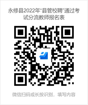 2.报考方式。报考方式为网上报考,考生用微信扫描或长按识别公告中的报考专用二维码(详见附件2),打开WPS表单(永修县2022年“县管校聘”通过考试分流教师报名表),严格按报考要求认真填报相关信息,考生应诚信报考,对本人填报内容确认无误后再提交,报考时间结束后不可再修改报考信息。