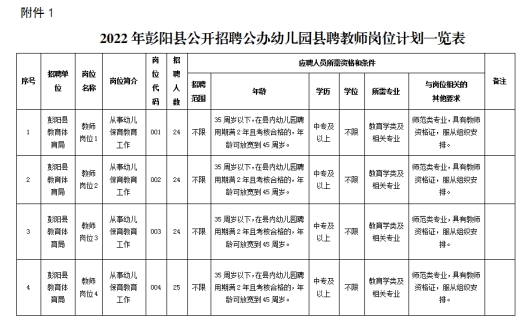 2022年,全县公办幼儿园计划面向社会公开招聘县聘教师97名。具体范围、条件等详见《2022年彭阳县公开招聘公办幼儿园县聘教师岗位计划一览表》(附件1)。