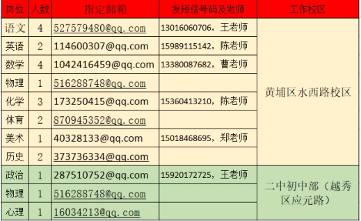 语文、数学、英语、物理、化学、政治、历史、心理、艺术(书法)、体育招聘老师,共计22名。详见“五、招聘岗位要求”。