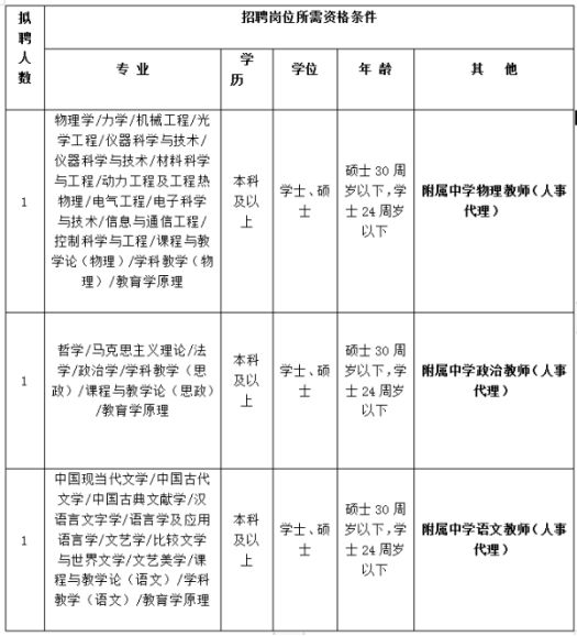 根据《淮北师范大学2022年度人才招聘公告》,经研究,学校决定近期开展2022年度附属中学教师(人数共3人,其中物理1人、语文1人、政治1人,人事代理)招聘工作,现将有关事项公告如下:
