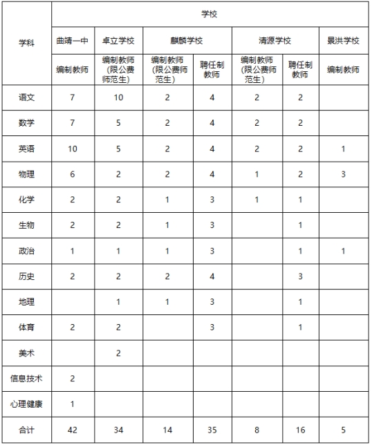 01招聘人员必须符合下列基本条件1.热爱教育事业,具有良好的思想政治素质和高尚的道德情操,具有较强的责任心、事业心和奉献精神;2.身心健康,符合事业单位聘用规定的体检要求;3.愿为曲靖一中教育集团服务10年以上;4.招聘高校毕业的博士研究生不超过35周岁,硕士研究生不超过30周岁;5.博士研究生、硕士研究生、学士毕业生均要求取得相应学位;6.具有高级中学或同等级别教师资格证。