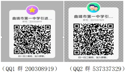 并通过微信小程序上传相关证件材料:2021、2022年毕业生通过微信小程序上传本人二代有效身份证、毕业证、学位证、教师资格证、个人简历、学习成绩单。2023年毕业生通过微信小程序上传身份证、就读学校出具的学历、学位及学历性质证明、个人简历、学习成绩单(格式为JPG或PDF,图像清晰)。(2)第二步:请扫码加入“曲靖市第一中学引进2023年教育人才QQ1群(200308919)”或“曲靖市第一中学引进2023年教育人才QQ2群(537337329)”,入群后以“学科+学校+姓名”命名。