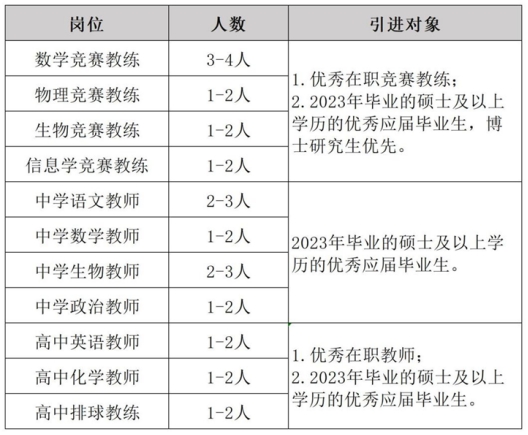 ①数学竞赛教练3-4人;②物理竞赛教练1-2人;③生物竞赛教练1-2人;④信息学竞赛教练1-2人。