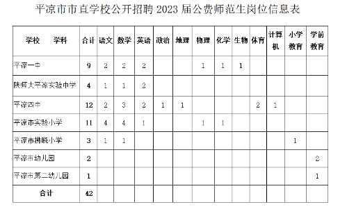 为进一步加强市直学校教师队伍建设,补充优化教师配备结构,平凉市决定在教育部直属师范大学2023届公费师范毕业生中为相关学校公开招聘教师42名。现将有关事项公告如下。