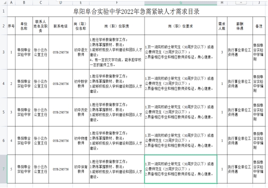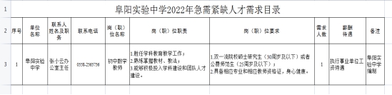 4.岗位需求目录详见附件1《阜阳实验中学2022年急需紧缺人才需求目录》、附件2《阜阳阜合实验中学2022年急需紧缺人才需求目录》;