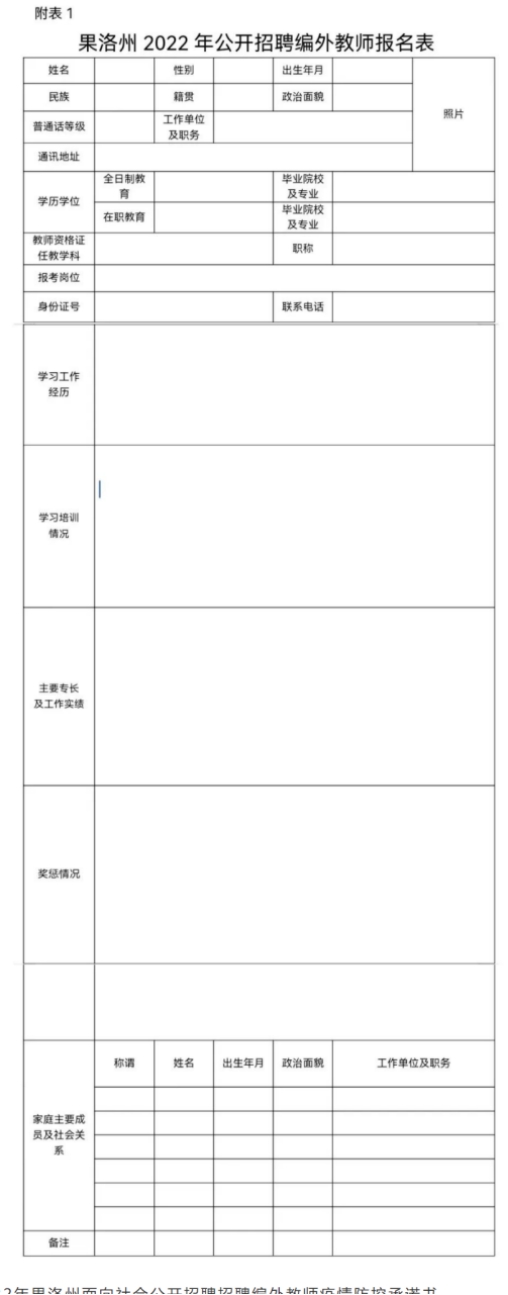 (5)近期免冠小二寸彩色蓝底电子照片,《果洛州2022年公开招聘编外教师报名表》;