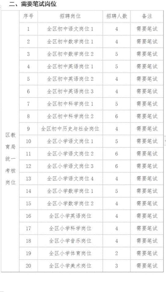 区教育局统一考核岗位中,参加同一岗位面试人员超过40人的,面试前进行笔试,按笔试成绩高低取前40名进入面试。通过资格审查,共有20个岗位符合报名条件的人员超过40人,需要进行笔试。