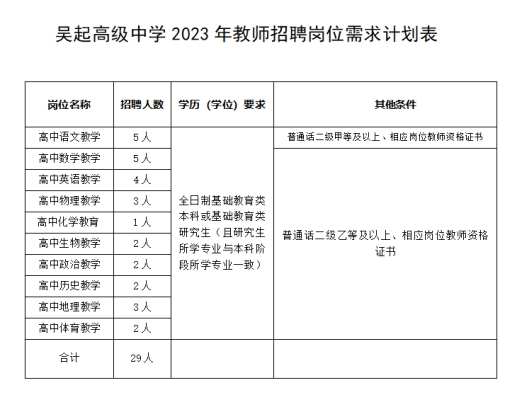 招聘教师29人。分别为:语文教师5人,数学教师5人,英语教师4人,物理教师3人,化学教师1人,历史教师2人,地理教师3人,生物教师2人,政治教师2人,体育教师2人。具体岗位及要求详见附表《吴起高级中学招聘教师岗位需求计划表》。