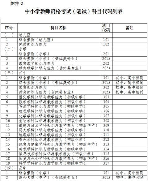 按照教育部教师工作司《关于中小学教师资格考试音、体、美专业考生公共科目单独编码的通知》(教师司函〔2017〕34号)要求,为完善中小学教师资格考试制度设置,加强中小学音、体、美专业教师队伍建设,从2017年上半年考试开始,对音、体、美专业考生的笔试公共科目一、科目二(科目代码:201、202、301、302)实行单独编码(相应科目代码:201A、202A、301A、302A),考试内容暂与原科目相同。