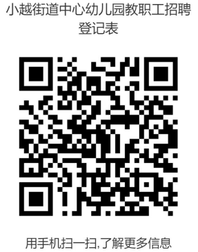 欢迎优秀人员加入我们小越街道中心幼儿园,有意者请电话联系报名(张老师:18892625093)或扫描下方二维码下载并填写招聘登记表,发送至1455494615@qq.com。具体面试时间及面试地点,将在面试邀约时告知。