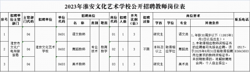 为促进教育事业发展,优化人员结构,加强教师队伍建设,根据《江苏省事业单位公开招聘人员办法》(苏办发〔2020〕9号)、《省教育厅、省人力资源和社会保障厅关于进一步做好全省中小学校新进教师公开招聘工作的意见》(苏教规〔2016〕1号)和市委组织部、市人社局《关于进一步做好事业单位公开招聘工作的通知》(淮人社发〔2011〕525号)等有关文件规定,经研究,决定面向社会公开招聘教师3人(事业编制)。现将有关事项公告如下: