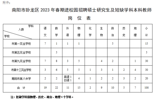 进校园公开招聘教师100名。具体岗位详见《南阳市卧龙区2023年春期进校园招聘硕士研究生及短缺学科本科教师岗位表》(见附件)。