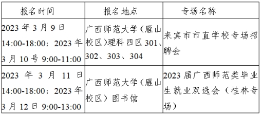 招聘工作按招聘活动场次的时间顺序进行,招聘岗位计划按照招聘场次的岗位计划完成招聘人数进行核减,已完成招聘的岗位计划不再进行招聘。来宾市市直学校在广西师范大学(雁山校区)举办的专场招聘会招聘的岗位为《来宾市市直学校2023年教师招聘岗位计划表(第二批)》所列岗位,2023届广西师范类毕业生就业双选会(桂林专场)的招聘岗位根据上一场专场招聘会结束后的招聘情况确定,在来宾市人才网和招聘现场公布。