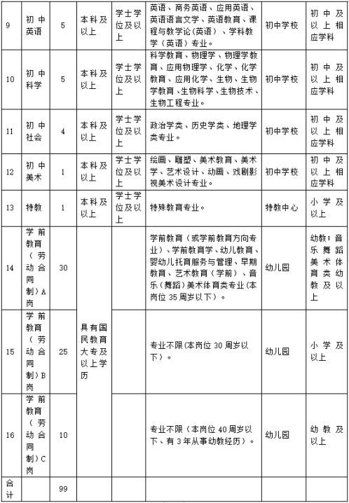 2023年计划招聘全额事业编教师34名,学前教育劳动合同制教师65名。各学科招聘人数、学历学位要求及招聘的岗位如下: