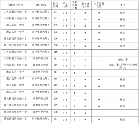 江苏省灌云县教育局所属学校2023年赴高校公开招聘新教师第二站(淮阴师范学院)报名工作已经结束。由于部分岗位报名人数没有达到开考比例要求,按照《江苏省灌云县教育局所属学校2023年赴高校公开招聘新教师公告》要求,对相应岗位进行了核销、核减,部分岗位降低开考比例为1:2,岗位开考情况见下表: