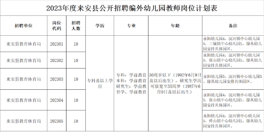 2023年度来安县公开招聘编外幼儿园教师50名,招聘计划(岗位)等信息于6月2日起在来安县人民政府网站(http://www.laian.gov.cn/)发布。