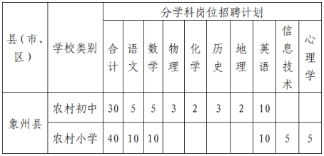 共招聘义教特岗教师70名,其中:初中30名,小学40名。具体岗位招聘计划详见下表。