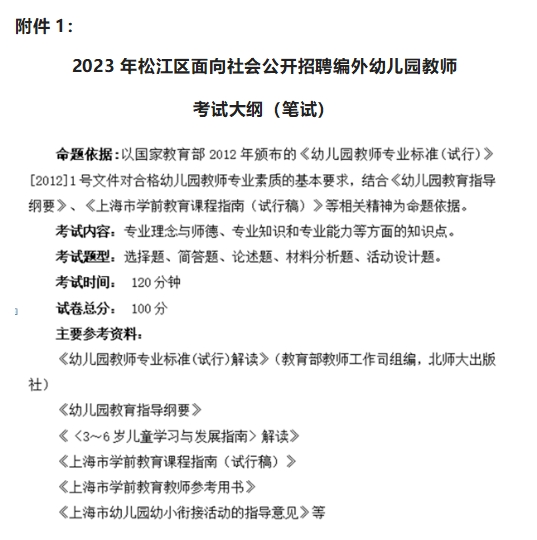(三)统一笔试2023年松江区编外幼儿园教师招聘统一笔试由区教育局组织实施。