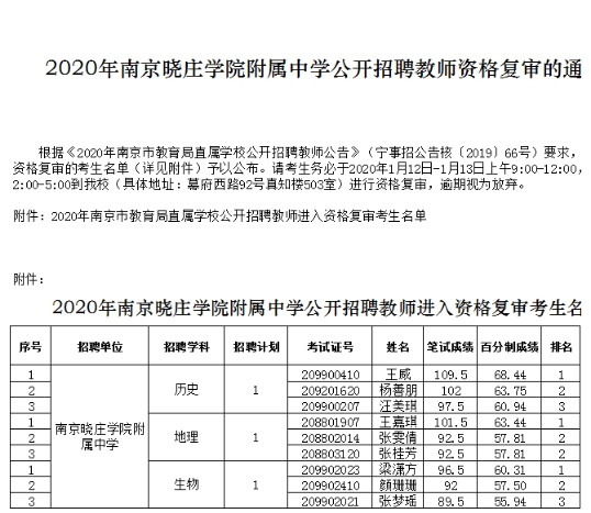 2020年南京晓庄学院附属中学教师招聘进入资格复审考生名单