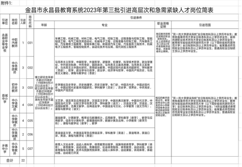 永昌县教育系统2023年第三批计划引进高层次和急需紧缺人才共22名,具体岗位和条件详见《金昌市永昌县教育系统2023年第三批引进高层次和急需紧缺人才岗位简表》(附件1,以下简称《岗位简表》)。