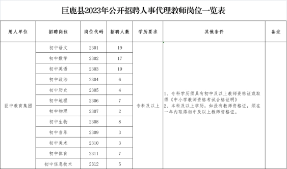 为进一步促进全县教育事业优质发展,根据巨鹿县教师需求,经研究,决定为巨中教育集团面向社会公开招聘人事代理初中教师100名,现公告如下: