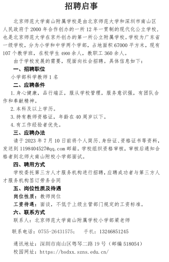 广东省北京师范大学南山附属学校小学部2023年7月科学教师招聘公告