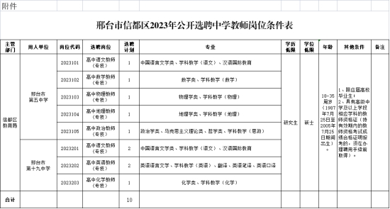 附件:《邢台市信都区2023年公开选聘中学教师岗位条件表》