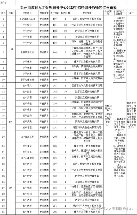 附件1:彭州市教育人才管理服务中心2023年招聘中小学编外教师岗位分布表