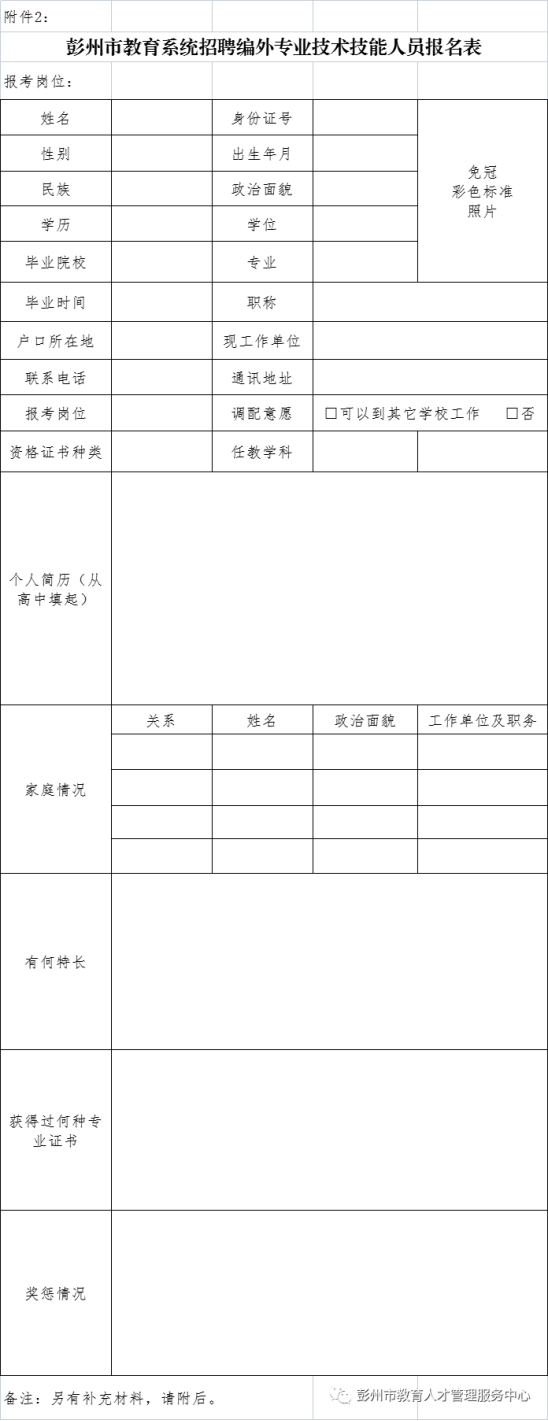 附件2:彭州市教育系统招聘编外专业技术技能人员报名表