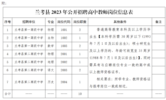 本次计划招聘高中教师10名,具体岗位见《兰考县2023年公开招聘高中教师岗位信息表》(附件)。