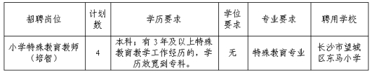 (1)小学特殊教育教师(培智)岗位:学历要求为本科;有3年及以上特殊教育教学工作经历的(不含校外机构工作经历),学历放宽到专科。专业要求为特殊教育专业。
