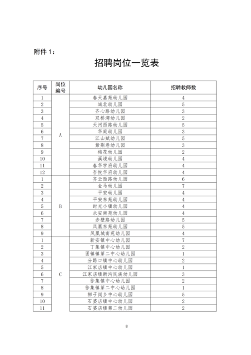 计划招聘131名劳务外包制幼儿园教师。本次招聘设A、B、C岗,同一考生只能选择一个岗位报考。各岗位所含幼儿园及招聘教师人数见附件1。
