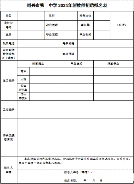 附件:《绍兴市第一中学2024年新教师招聘报名表》