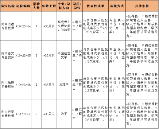 附中本次招聘政治专任教师1名,语文专任教师1名,地理专任教师1名,数学专任教师2名。具体要求如下:
