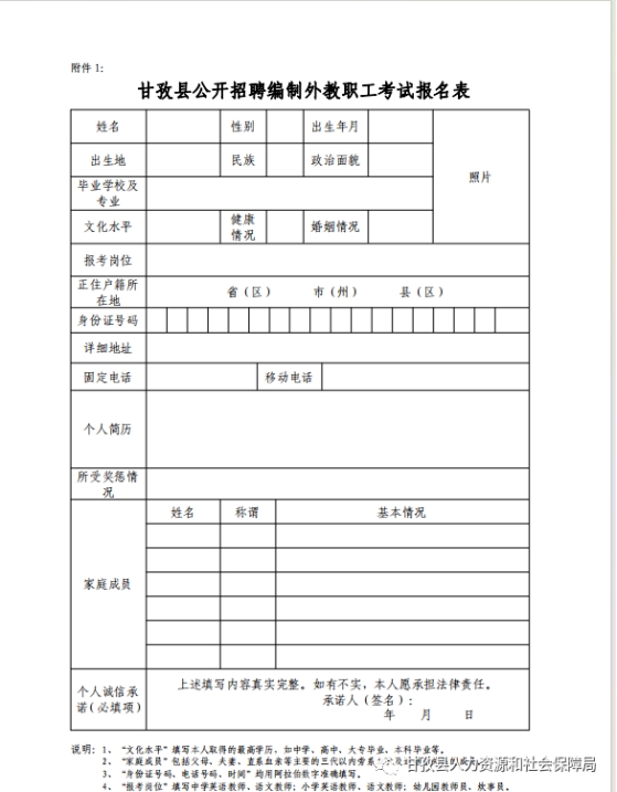 (1)《甘孜县公开招聘编制外教职工考试报名表》(附件1)1份。