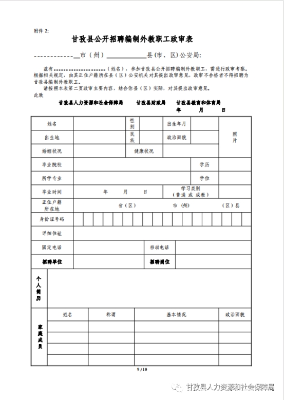 (2)提交常住人口户口簿、毕业证、教师资格证书原件及复印件、《甘孜县公开招聘编制外教职工政审表》原件(附件2)双面打印各1份。