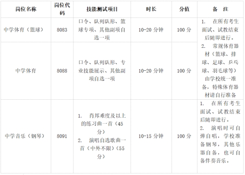 ②中学体育(篮球)、中学体育、中学音乐(钢琴)岗位考核由面试、试教、技能测试组成,其他岗位考核由面试、试教组成。面试、试教、技能测试满分均为100分。面试、试教时长共12分钟,准备时长共60分钟。中学体育(篮球)、中学体育、中学音乐(钢琴)岗位的技能测试办法见下表: