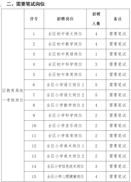 区教育局统一考核岗位中,参加同一岗位面试人员超过40人的,面试前进行笔试,按笔试成绩高低取前40名进入面试。通过资格审查,共有15个岗位符合报名条件的人员超过40人,需要进行笔试。